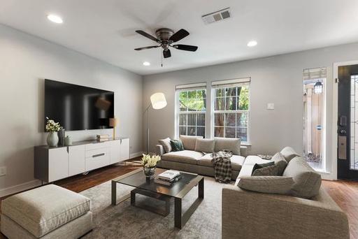 This newly upgraded to a 2-bedroom townhome on the Tournament Players Golf Course in Grogan's Mill offers modern style and striking golf course views! Enter through a gated courtyard into an updated interior featuring sleek wood-look flooring (no carpet!), recessed lighting and quality finishes throughout. The staircase is framed by a chic wrought iron handrail and a pendant light fixture. The main floor includes a spacious family room, a well-appointed kitchen with granite countertops, stainless steel appliances, and a breakfast peninsula, as well as a dining area that opens to the back patio. Upstairs, find the owner's suite with a study nook, walk-in closet, and en-suite bath, along with a second bedroom overlooking the golf course. The fenced backyard includes a patio and green space?perfect for relaxation or entertaining. With quick access to I-45, The Woodlands Town Center, The Waterway, The Pavilion, and Market Street, this home is ideally located for convenience and enjoyment.